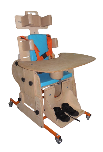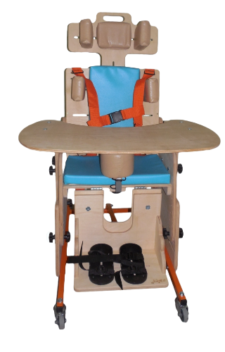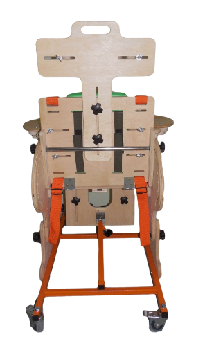 Опора с поддержкой головы и грудного отдела на мобильной колесной базе. Удобна для плавного перемещения ребенка между комнатами.