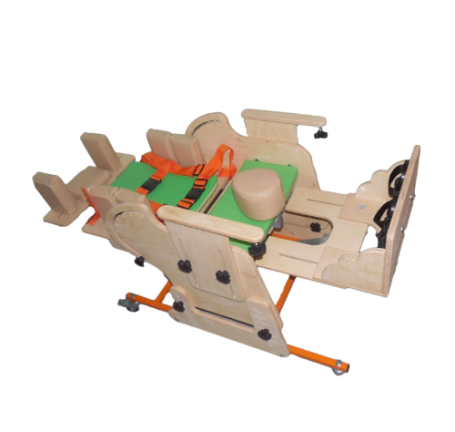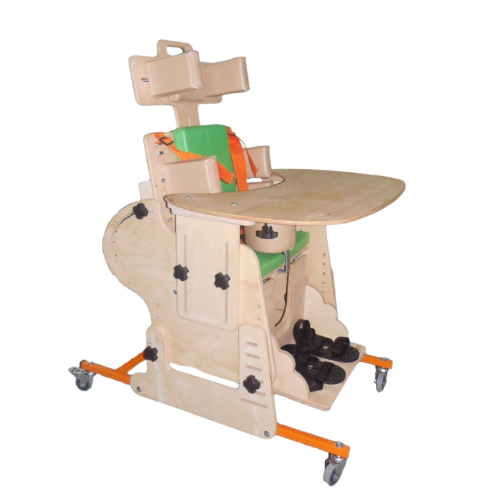 Медицинское изделие РУ № РЗН 2018/7609 “Опоры функциональные для сидения для детей-инвалидов “Я МОГУ!” Опора функциональная для сидения для детей-инвалидов “Я МОГУ!”, исполнение ОС-004 предназначена для реабилитационных мероприятий с детьми с ограниченными возможностями с патологиями различной степени тяжести, в том числе ДЦП, для поддержки и размещения ребенка в положении сидя, позиционной терапии, предотвращения и уменьшения физических проблем. Опора для сидения позволяет поэтапно переводить ребенка из положения лежа в положение сидя и в промежуточное положение полулежа за счет регулировки углов наклона спинки и подножки. Опора для сидения представляет собой ортопедическое кресло на деревянной раме, расположенной на металлическом четырехколесном основании. Все колеса поворотные, задние колеса оснащены стояночными тормозами. Сидение и спинка оснащены съемными мягкими подушками и мягкими упорами-ограничителями. На подножке расположены пластиковые крепления для ступней типа «сандалии» с задними упорами и крепежными ремешками. Опора оснащена подголовником и съемным столиком, устанавливаемым на подлокотники.
