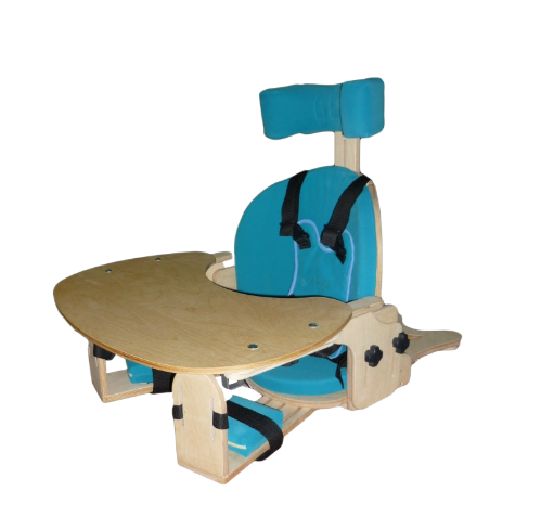 Опора для сидения представляет собой напольное ортопедическое кресло, состоящее из сидения и спинки, расположенной под углом 90 градусов относительно сидения. На спинке установлен съемный мягкий подголовник анатомической формы, регулируемый по высоте. Сидение оснащено подлокотниками, регулируемыми по высоте. На подлокотники устанавливается съемный столик для занятий и приема пищи, регулируемый по высоте и расстоянию до спинки кресла. Опора оснащена съемными платформами для ног, регулируемыми по длине и углу разведения, оснащёнными площадками для крепления ступней с крепежными ремнями и съемными элементами для крепления голеней.