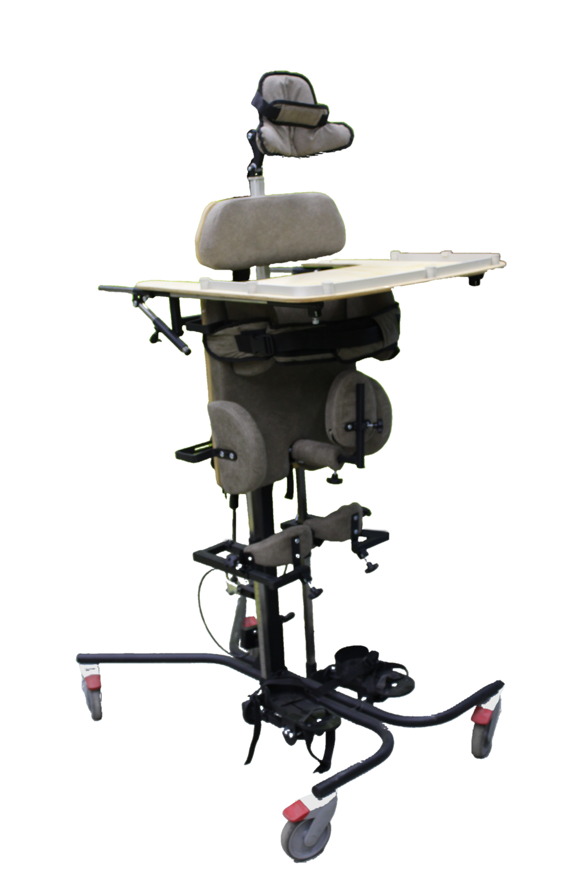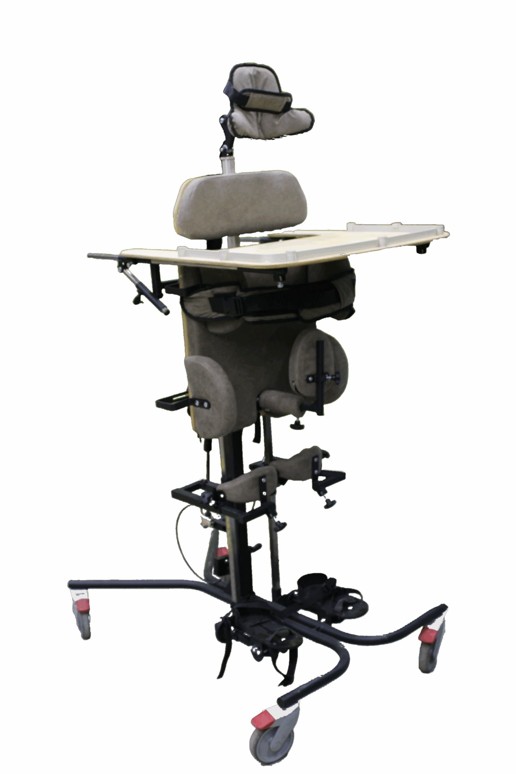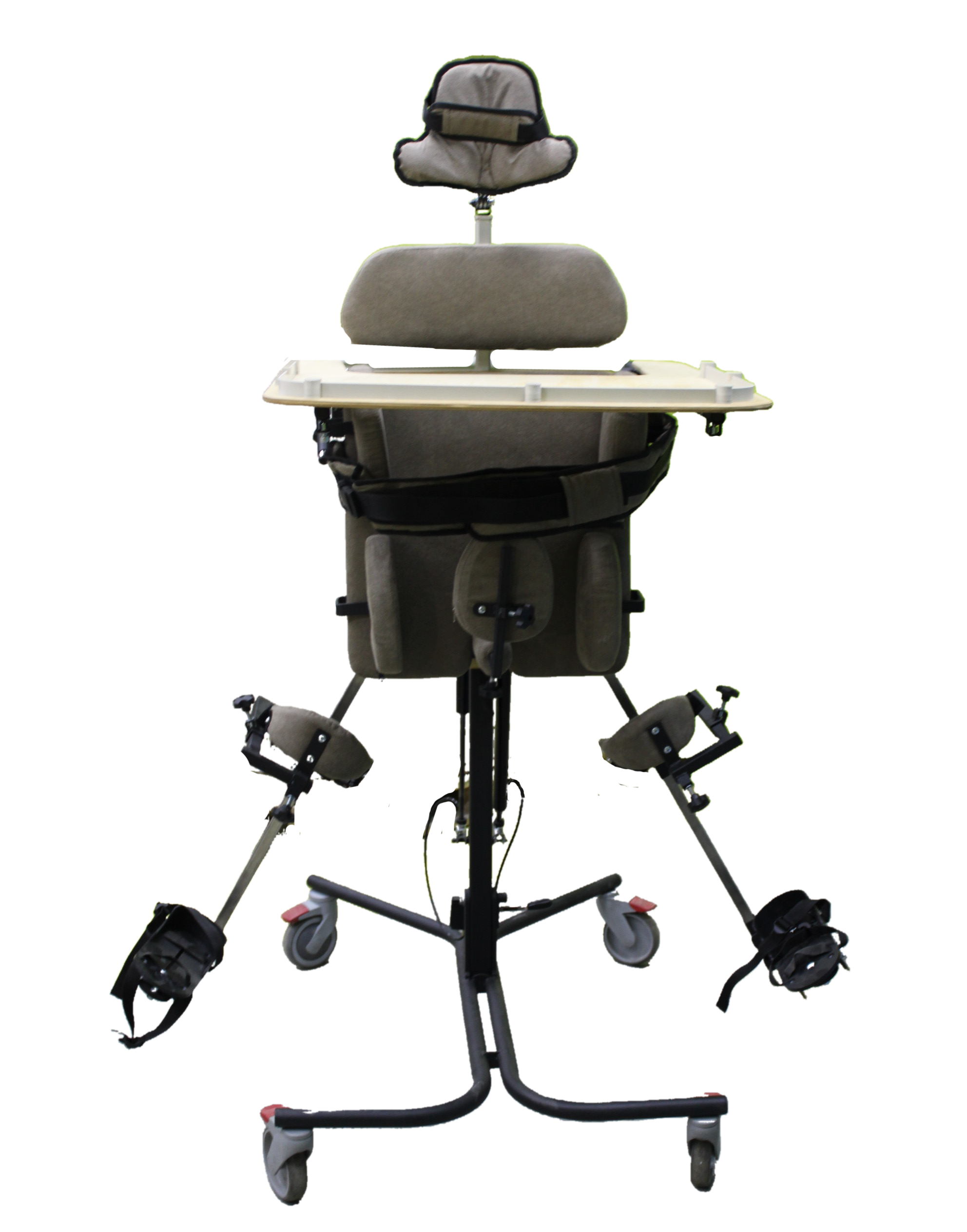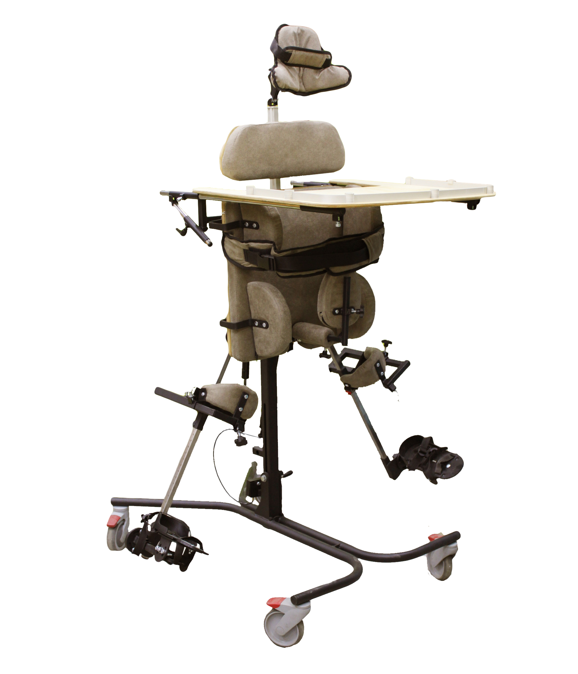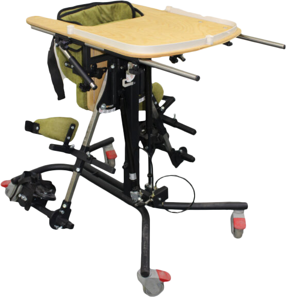 Опора для стояния (вертикализатор) с комбинированным наклоном и функцией абдукции на четырехколесном основании с поворотными колесами со стояночными тормозами, опора оснащена боковыми ограничителями, абдуктором, с устройством для разведения ног, с раздельными многопозиционными подножками со стоподержателями и многопозиционными коленоупорами, столиком, системой креплений в виде ремней и пневмоприводом. Медицинское изделие РУ № РЗН 2019/1856 “Опоры функциональные для стояния для детей-инвалидов “Я МОГУ!” В конструкции опоры предусмотрены следующие регулировки: