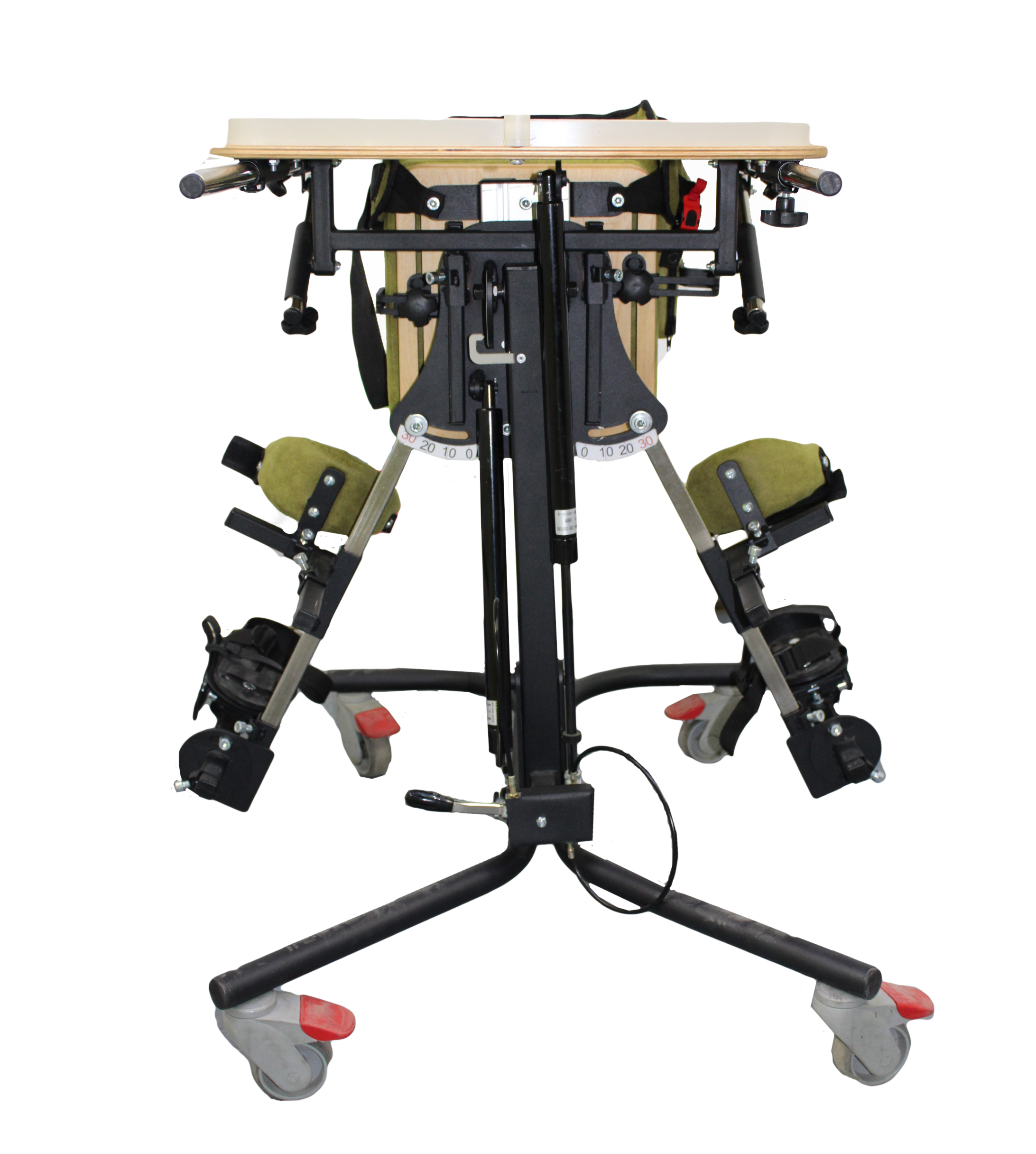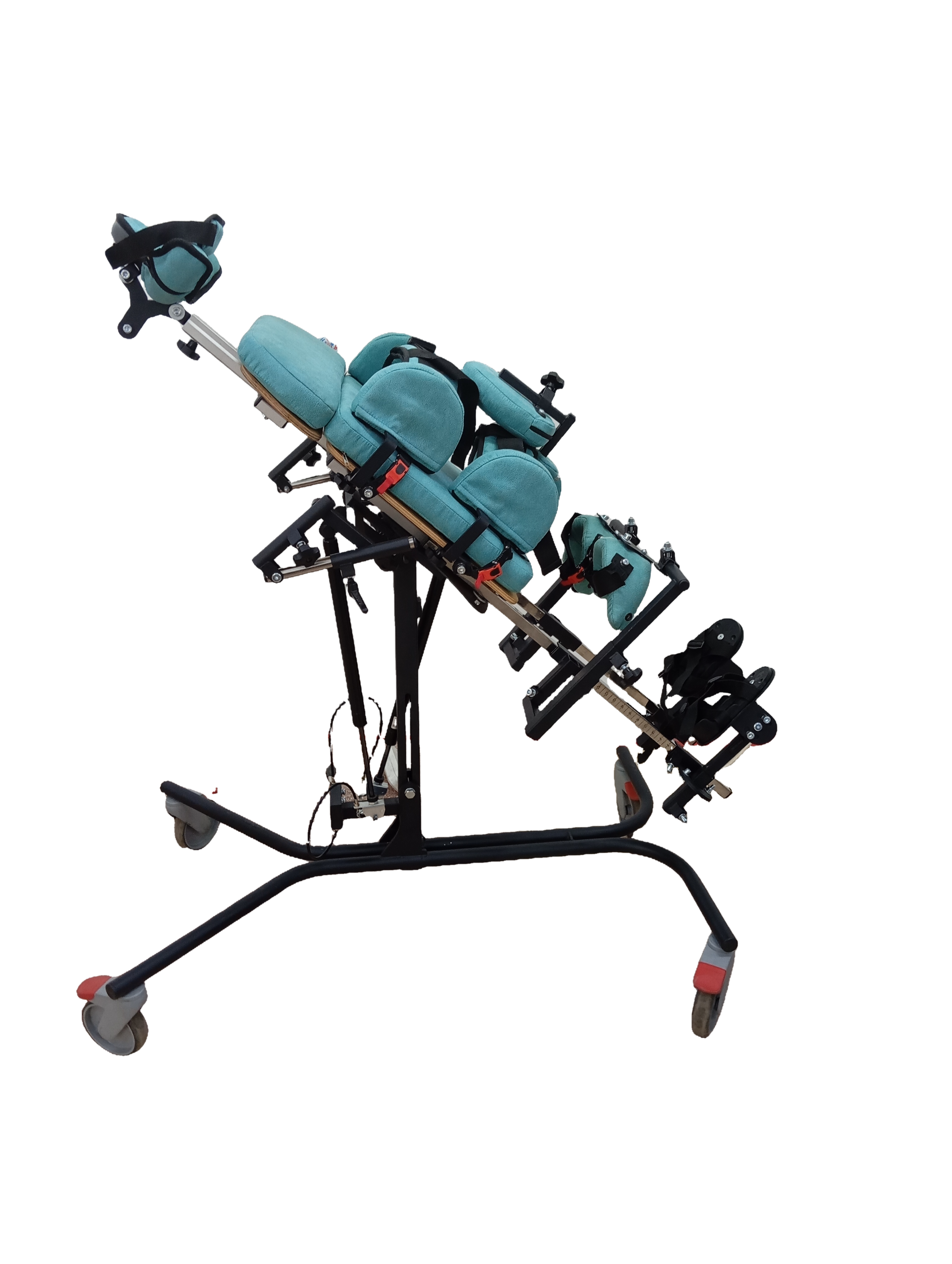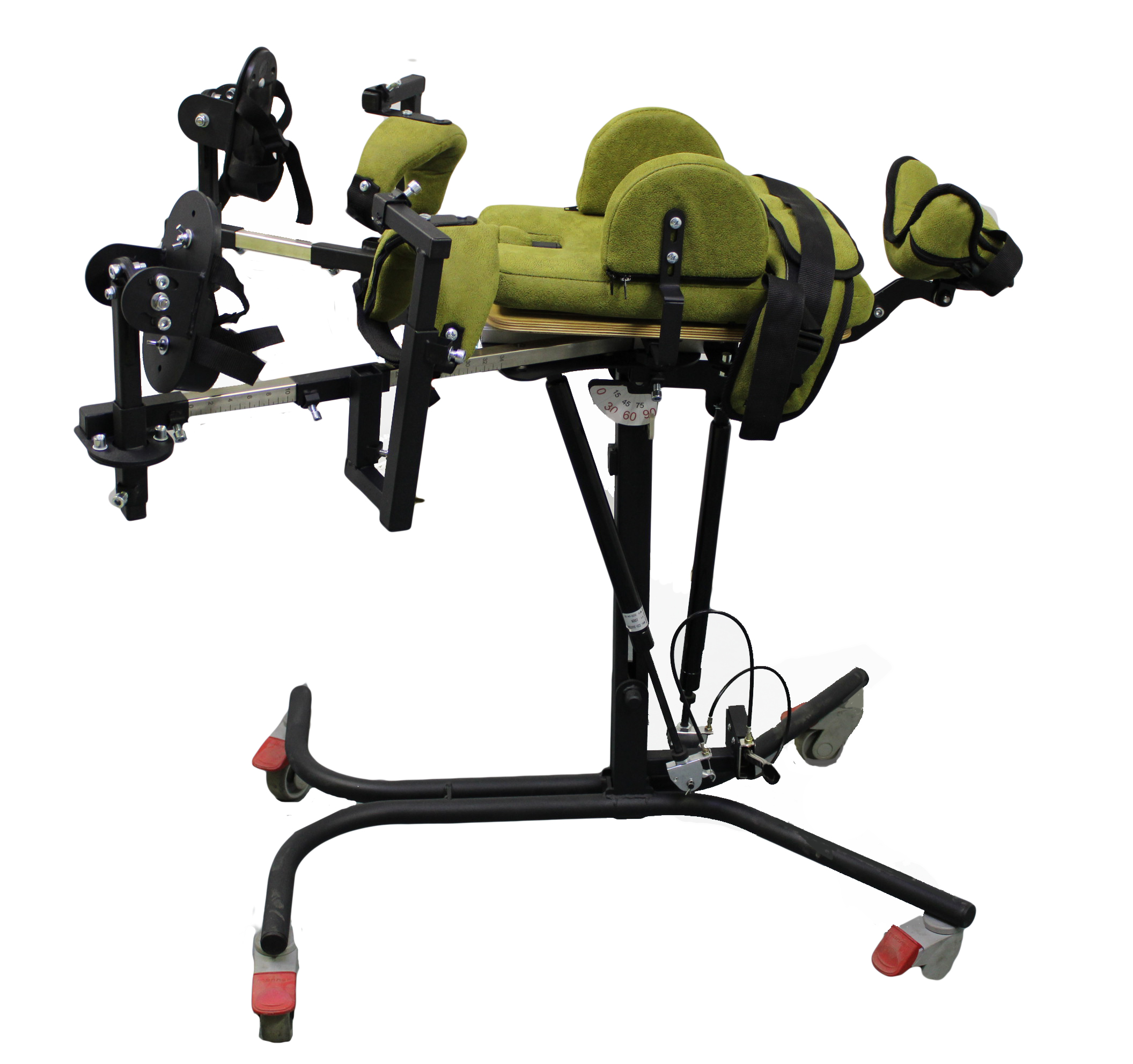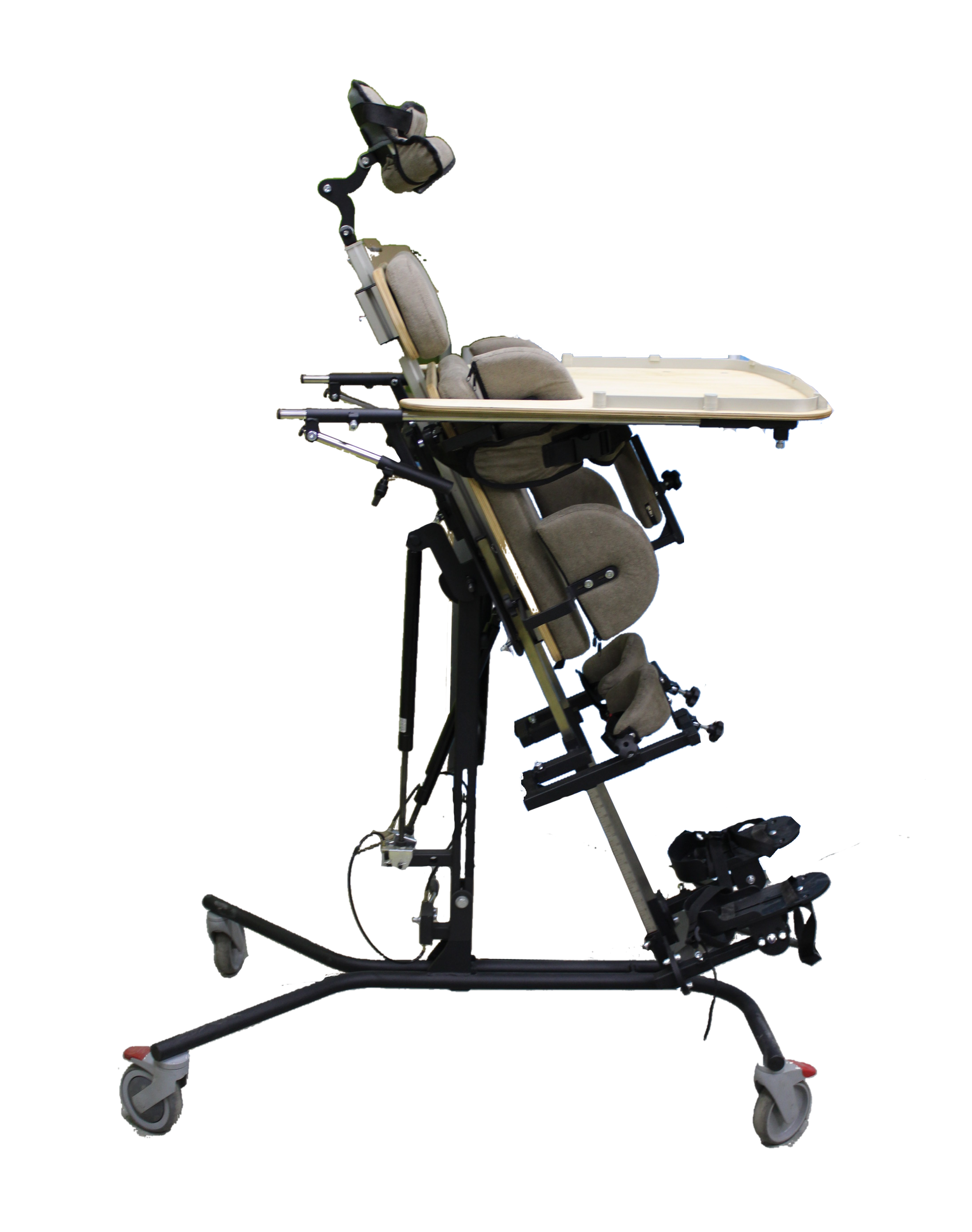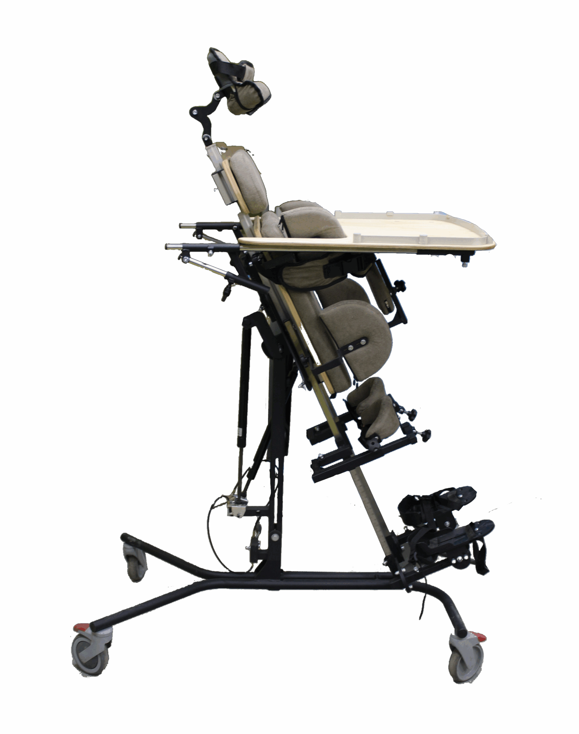Опора для стояния (вертикализатор) с комбинированным наклоном и функцией абдукции на четырехколесном основании с поворотными колесами со стояночными тормозами, опора оснащена боковыми ограничителями, абдуктором, с устройством для разведения ног, с раздельными многопозиционными подножками со стоподержателями и многопозиционными коленоупорами, столиком, системой креплений в виде ремней и пневмоприводом. Медицинское изделие РУ № РЗН 2019/1856 “Опоры функциональные для стояния для детей-инвалидов “Я МОГУ!” В конструкции опоры предусмотрены следующие регулировки: