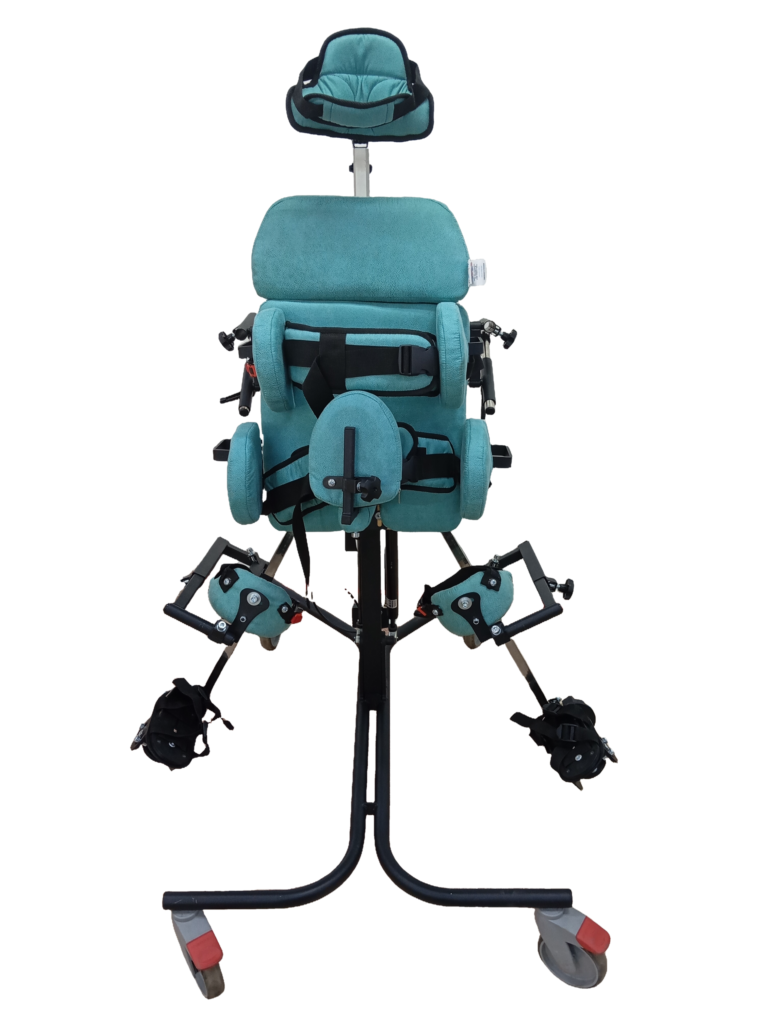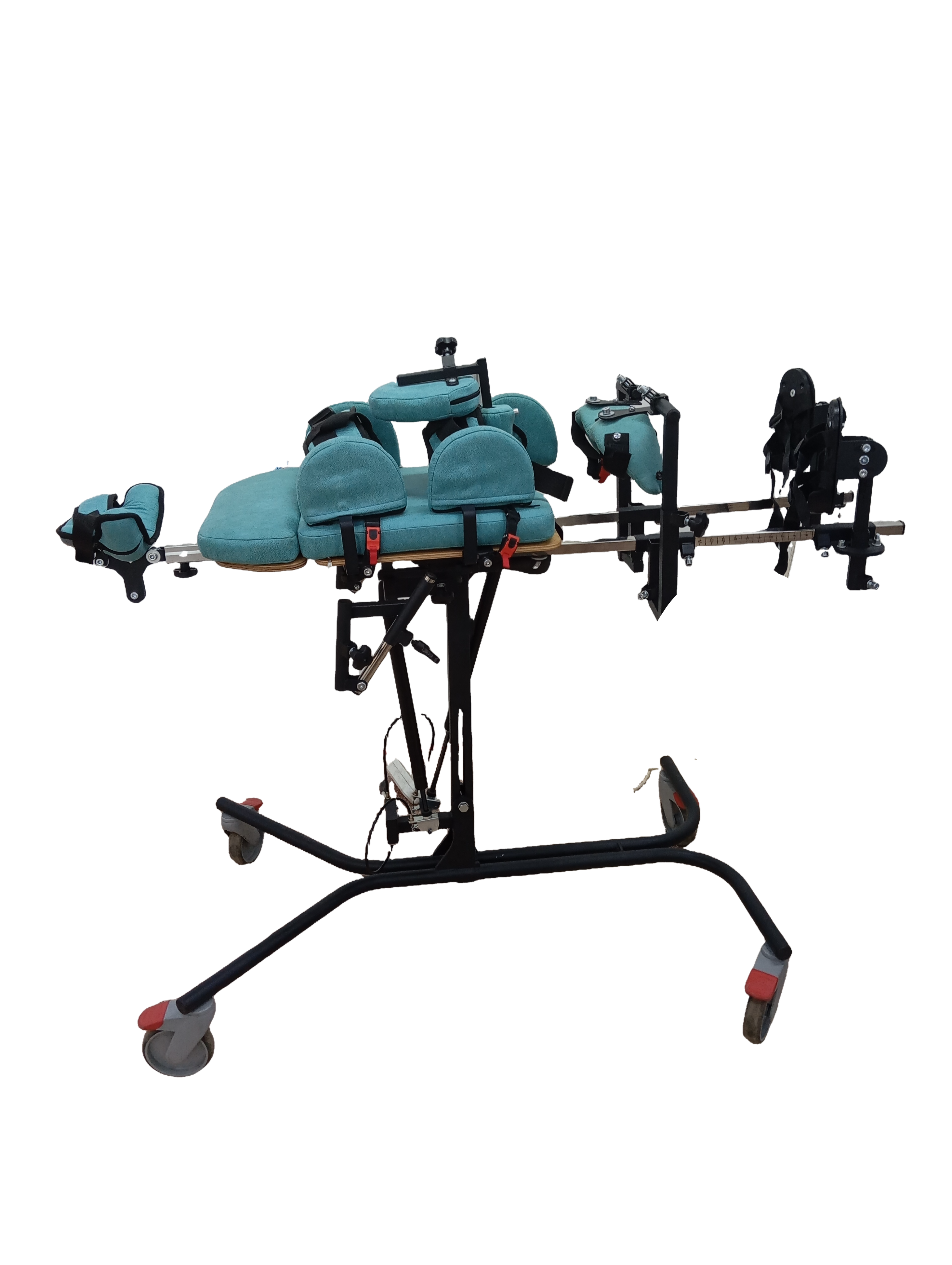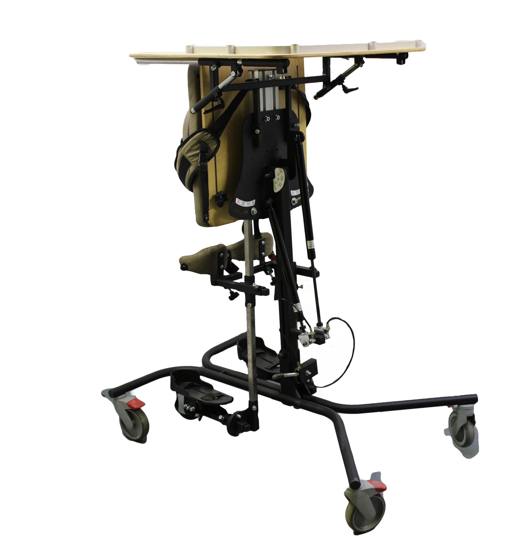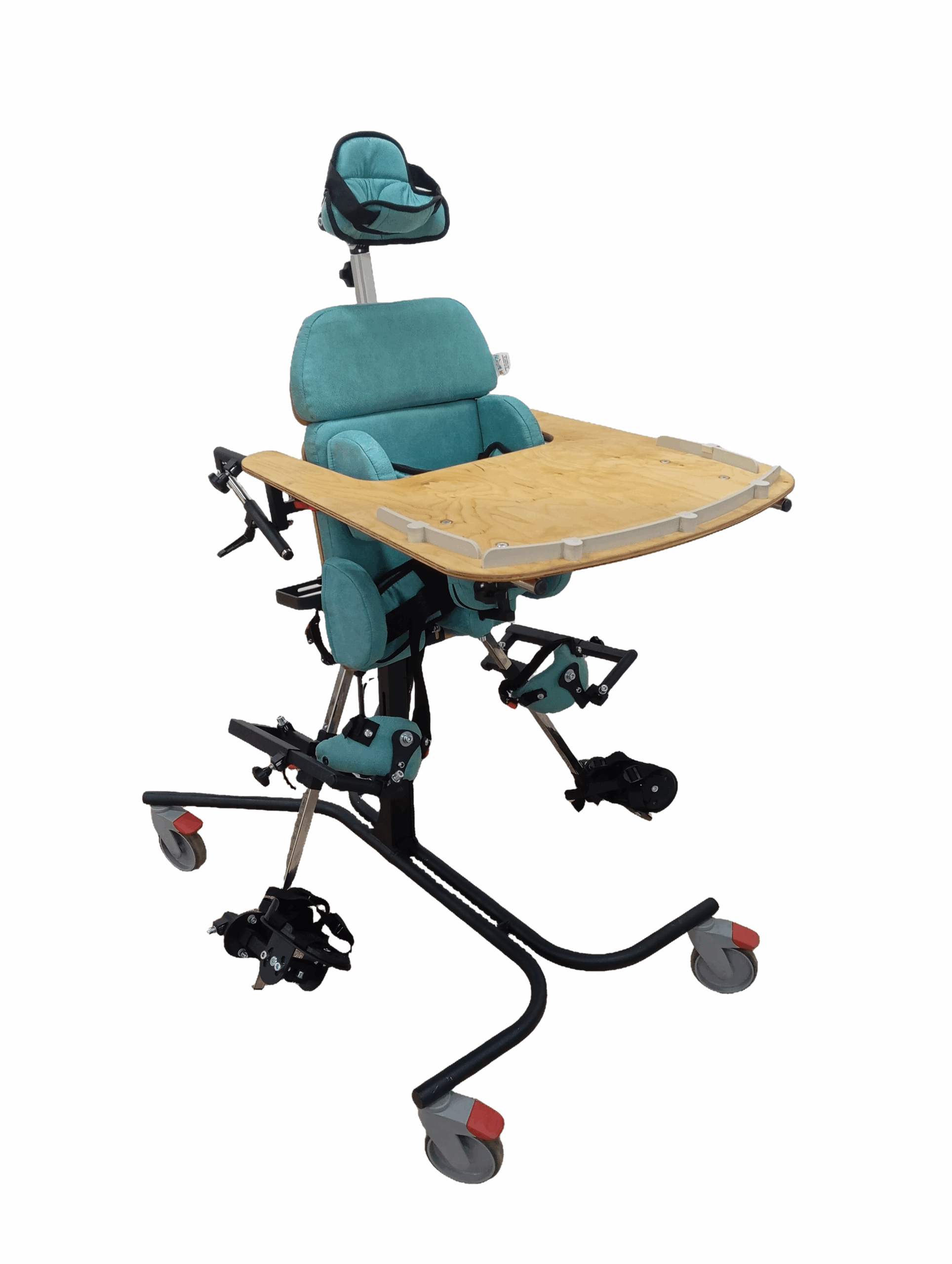 Опора для стояния (вертикализатор) с комбинированным наклоном и функцией абдукции на четырехколесном основании с поворотными колесами со стояночными тормозами, опора оснащена боковыми ограничителями, абдуктором, с устройством для разведения ног, с раздельными многопозиционными подножками со стоподержателями и многопозиционными коленоупорами, столиком, системой креплений в виде ремней и пневмоприводом. Медицинское изделие РУ № РЗН 2019/1856 “Опоры функциональные для стояния для детей-инвалидов “Я МОГУ!” В конструкции опоры предусмотрены следующие регулировки: