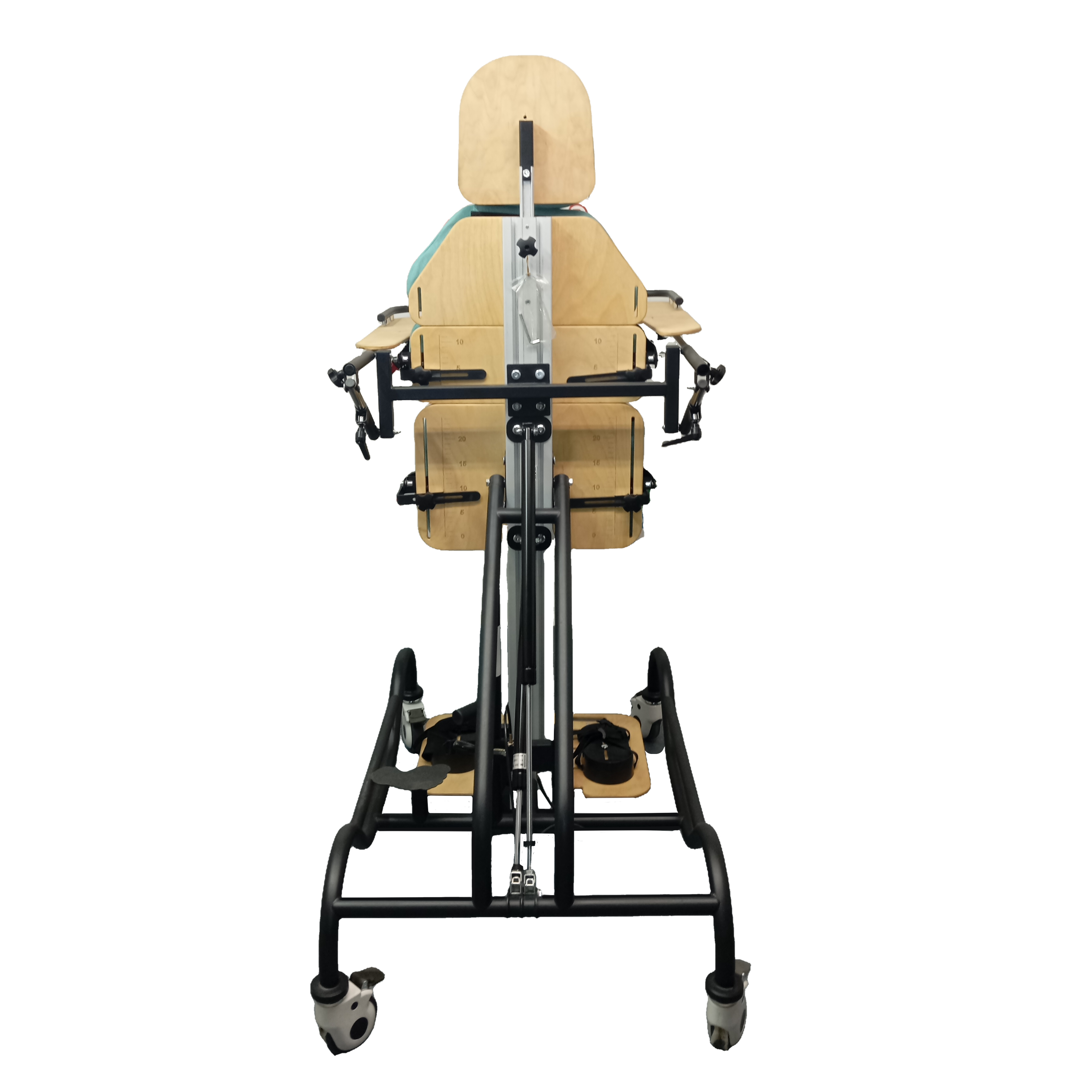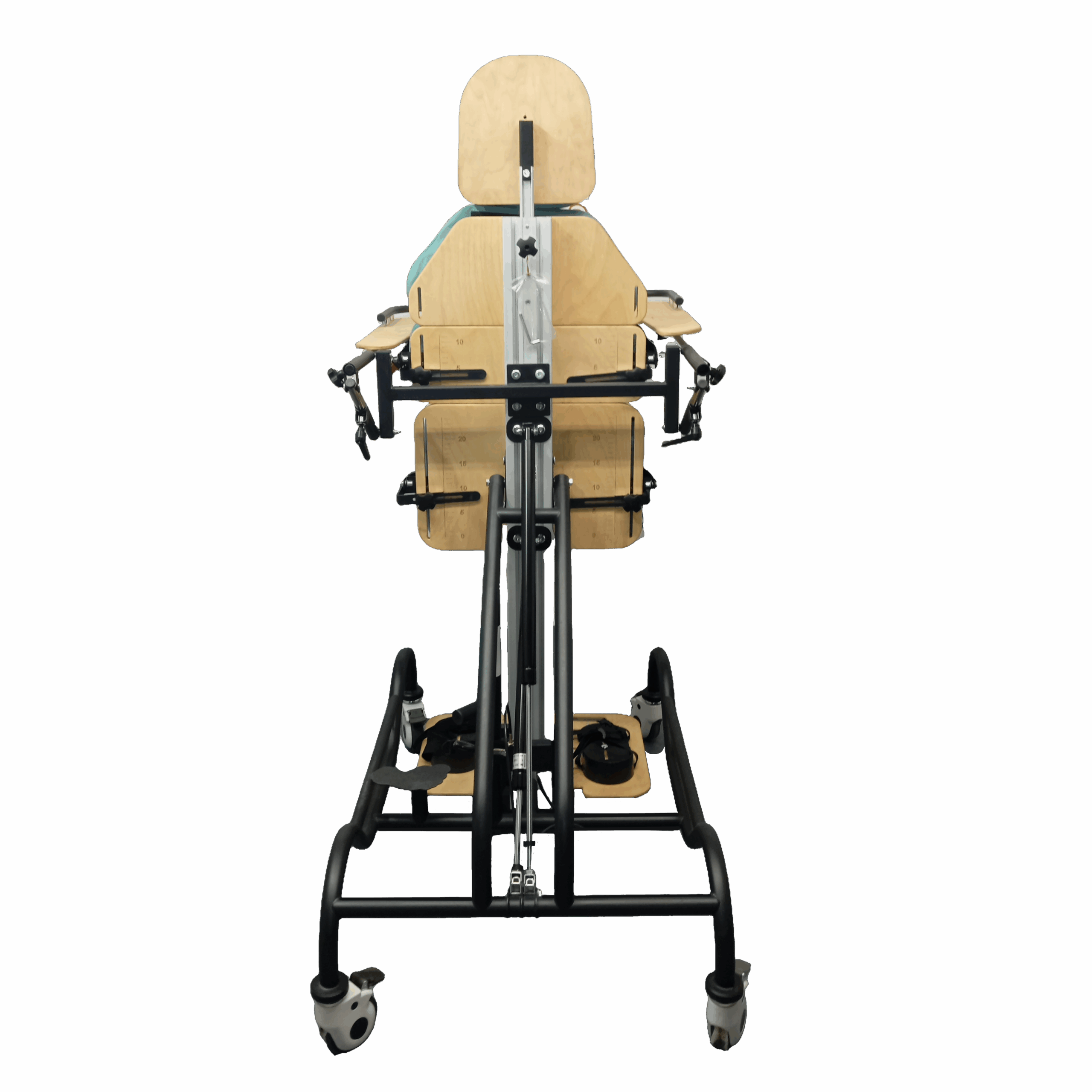 Аппарат с функцией независимого разведения ног. Базовая комплектация для классической терапевтической вертикализации с поддержкой стоп и коленных суставов.