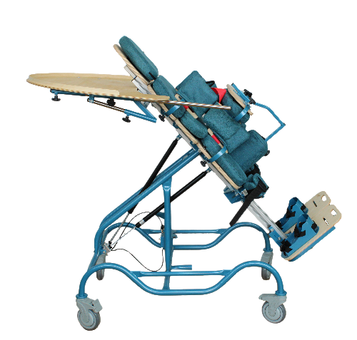 Базовый комплект включает многофункциональный вертикализатор с металлической рамой и с поворотным ложем со съемными модулями, подножкой со стоподержателями, абдуктором, системой креплений, боковыми упорами, съемным столиком и съемной секцией для бедер. Привод — пневматический